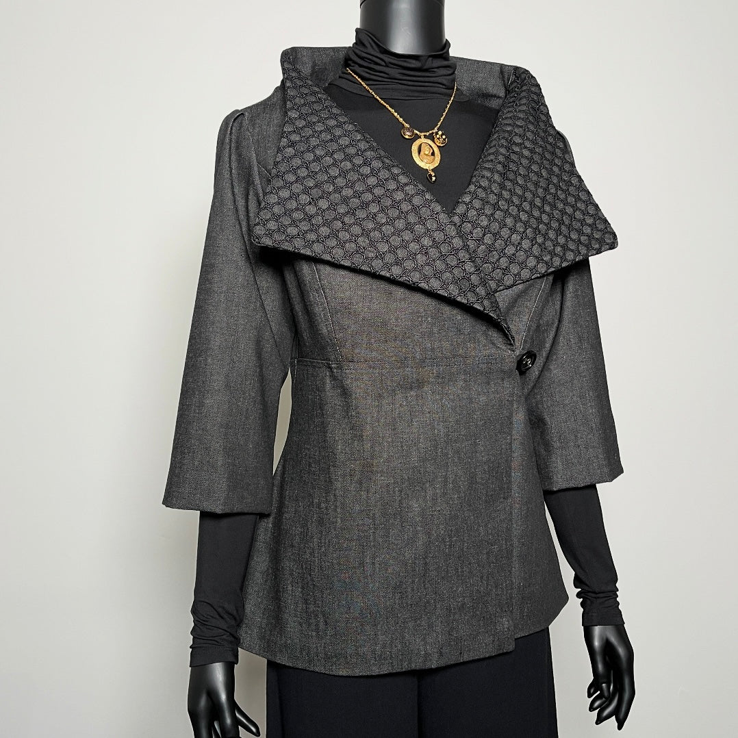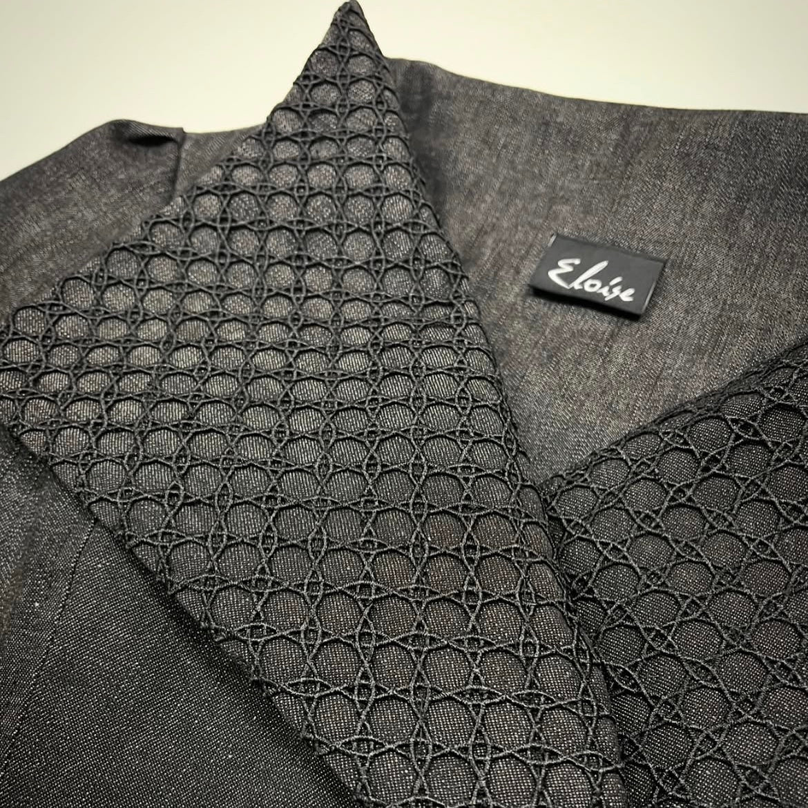 Impeccably tailored and holding structure and form, the sculptural shaping of the Eloise Clasique Jacket reflects a timeless grace and a piece to love and cherish for many years to come. The Clasique is a double breasted jacket with soft empire line, flattering waistline shaping and striking high collar and wide lapel. An edgy black denim with contrast luxe black mesh lace embellishing the wide lapel. Jewel length (3/4 length) fitted sleeve with soft pleat detail. A striking, sculptured silhouette combined with edgy fabric combinations with the warmth of luxurious design.