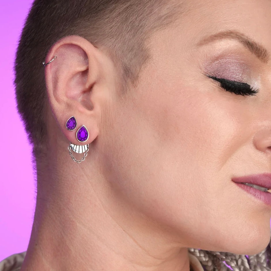 For the elegant everyday, these stunning fine earrings are designed to be worn in four fabulous ways. Effortlessly transition from day to night with interchangeable pieces. Sparkling purple teardrop studs, available in a twin set of two sizes, perfect for swapping and stacking. Wear the studs alone for a classic look, or elevate your style by adding the intricately engraved drop complete with a fine gold chain that hangs elegantly either in front or behind the lobe. Lightweight, yet striking for understated glamour. For those with multiple piercings, they look fabulous teamed with the matching threader earrings too.