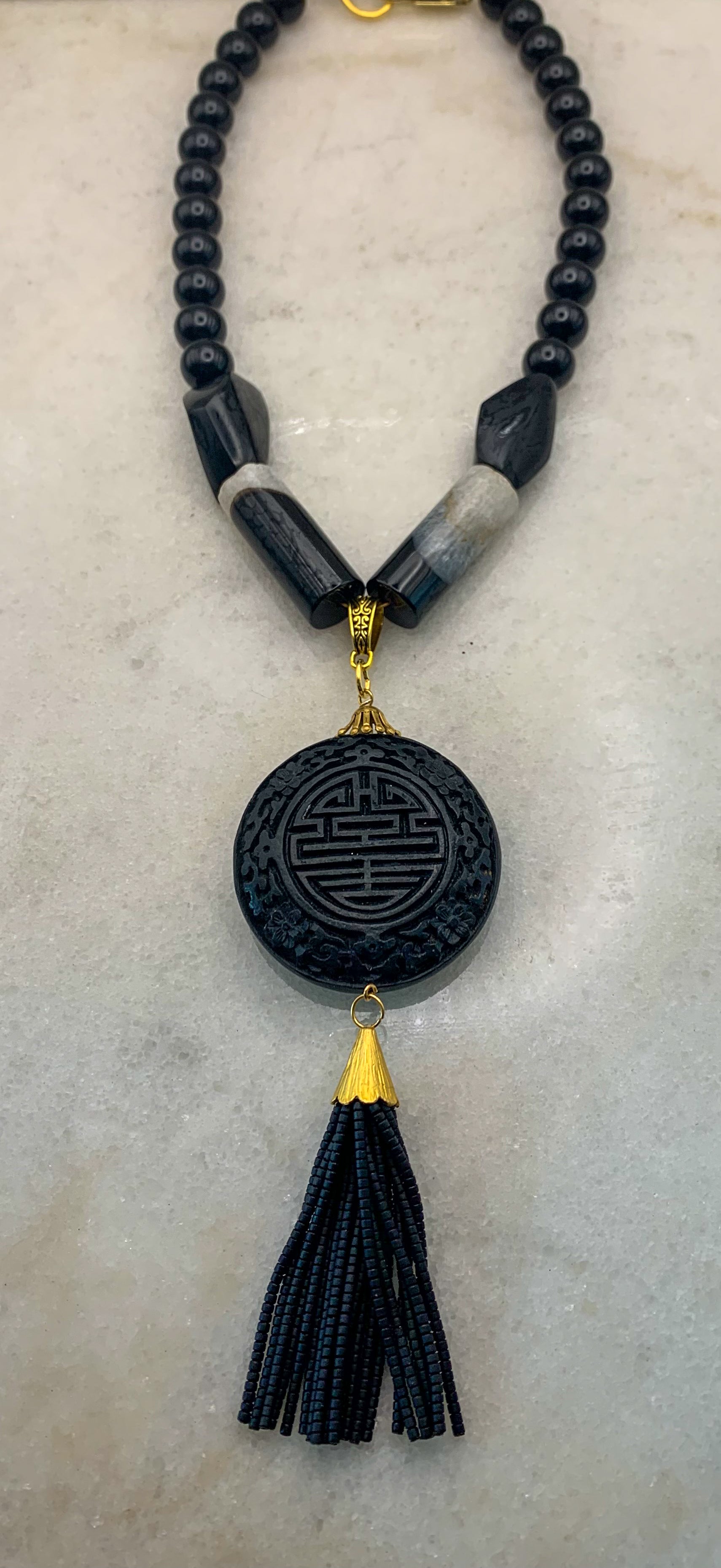 Elevate a special outfit, or adorn your everyday with this stunning necklace featuring a beautiful vintage ornate carved Chinese orb of happiness finished with a beaded tassel.