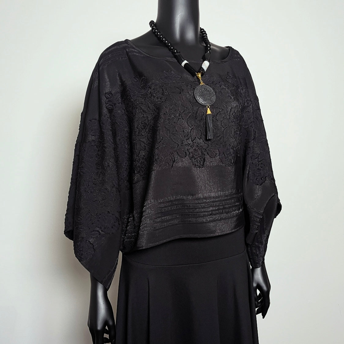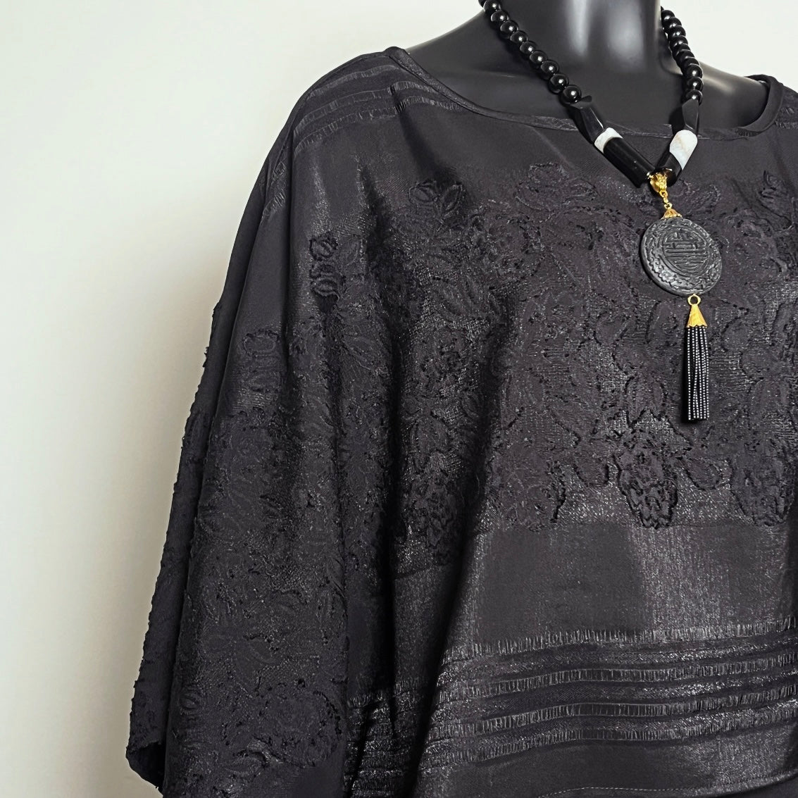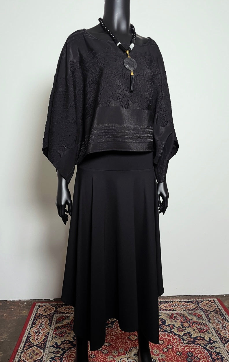 The Eloise Havana Top in our soft draping black jacquard creates a strong silhouette. Team it with our high waisted Inspire skirt or our wide leg pant. Layer it over your favourite dress, or dress it down with your favourite denims. With it's wide open sleeve, it's a unique layering piece too, making it a great alternative to a shawl, wrap or jacket.