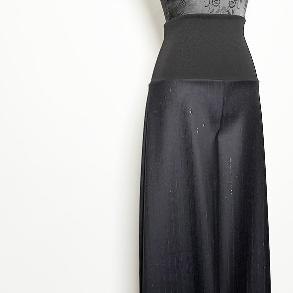 - Soft draping medium weight Italian black wool featuring subtle pinstripe with gold fleck.