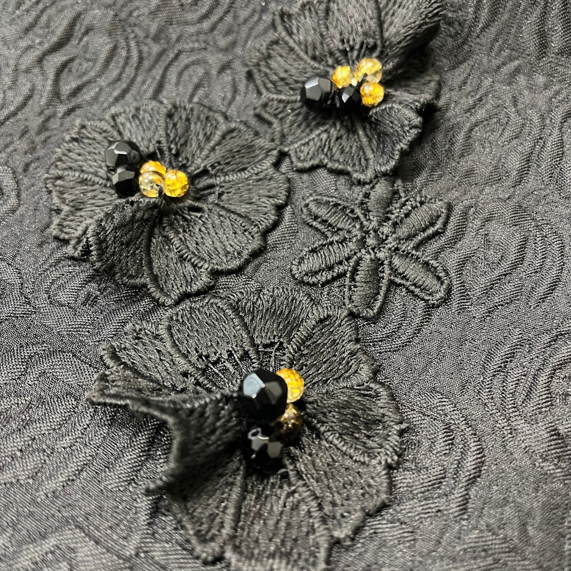 - Striking black floral jacquard with hand beaded 3D textured lace applique.