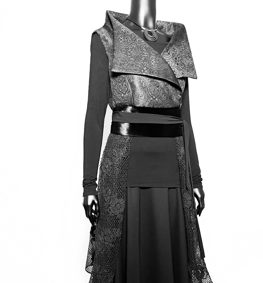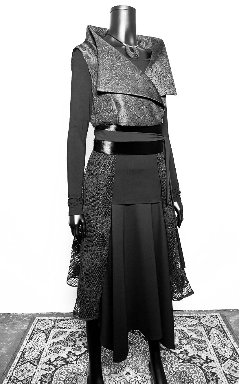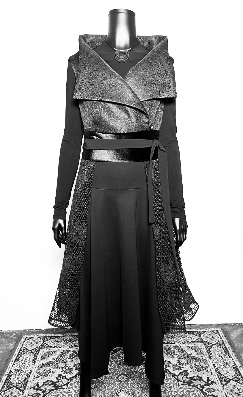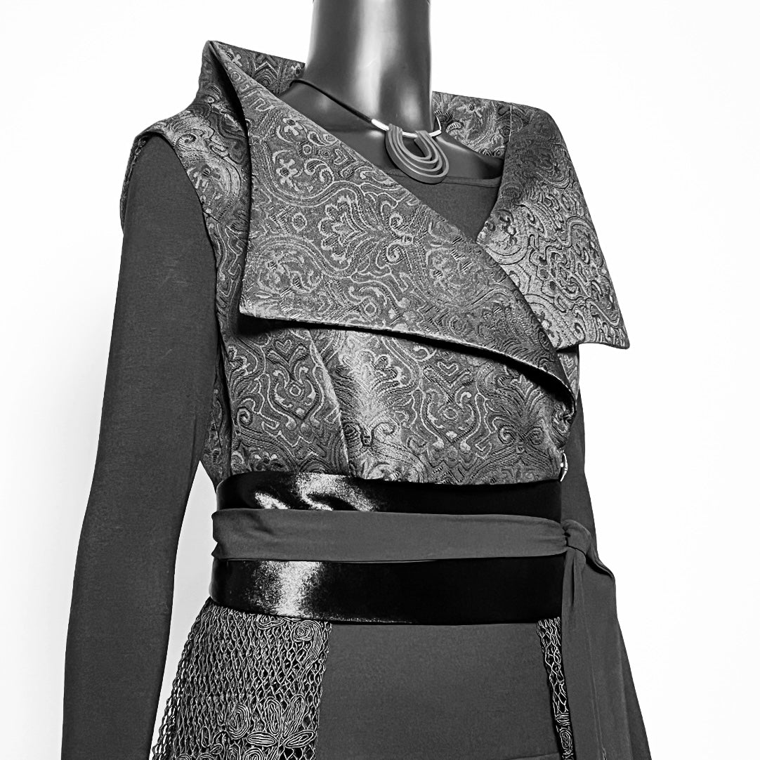 One Of A Kind Longline Vest And Obi Belt Set - Black Jacquard And Corded Mesh Lace
