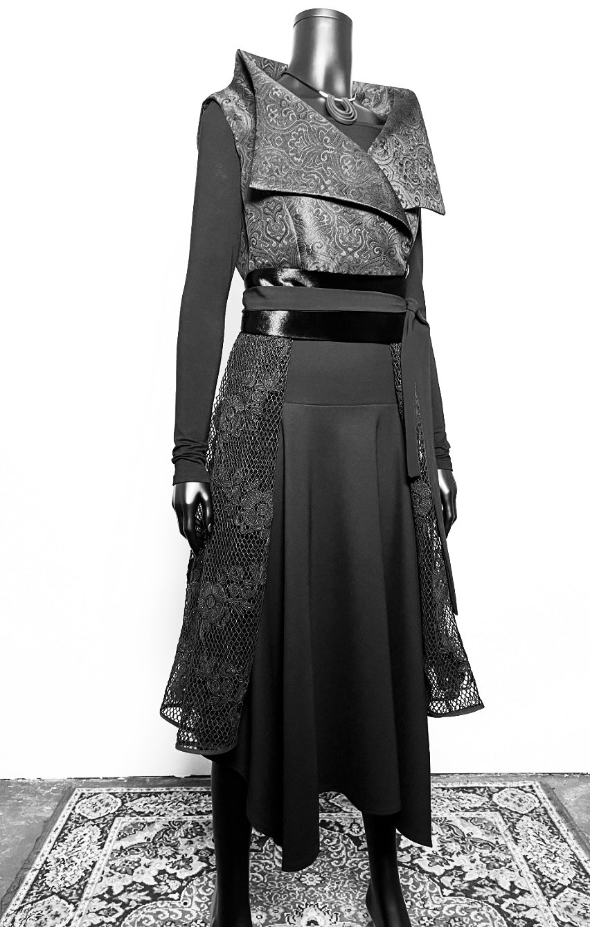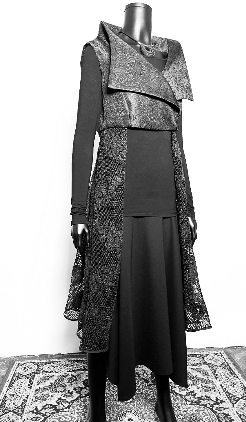 Impeccably tailored and holding structure and form, the sculptural shaping of the Eloise Longline Vest reflects a timeless silhouette and a piece to love and cherish for many years to come. This striking one of a kind piece is a double breasted vest with soft empire line, flattering waistline shaping and striking high collar and wide lapel. Beautiful soft details grace the bodice jacquard which is sculptured to create a striking silhouette. And featuring a luxe contrast soft draping corded mesh lace - an exquisite fabric with body and drape. All creating an elegant, sculptured silhouette with the warmth of luxurious design.