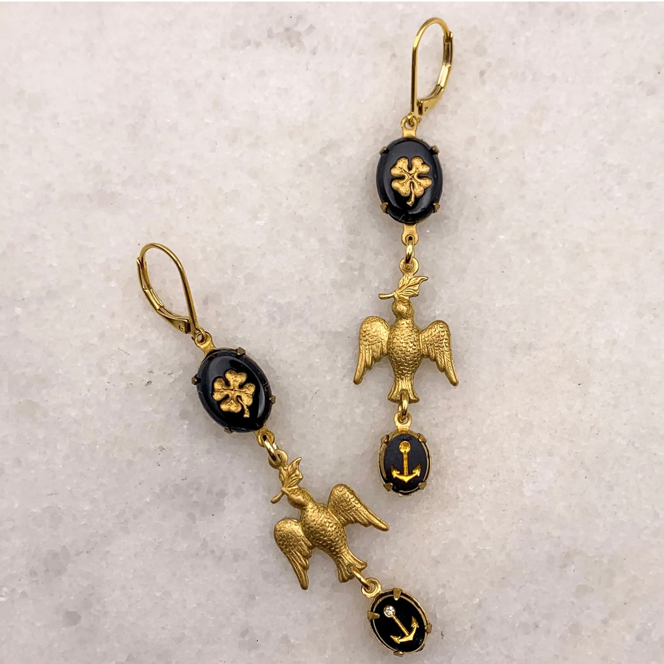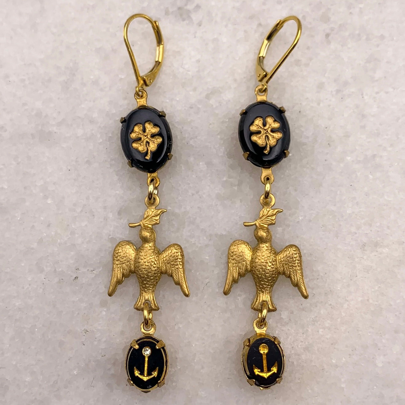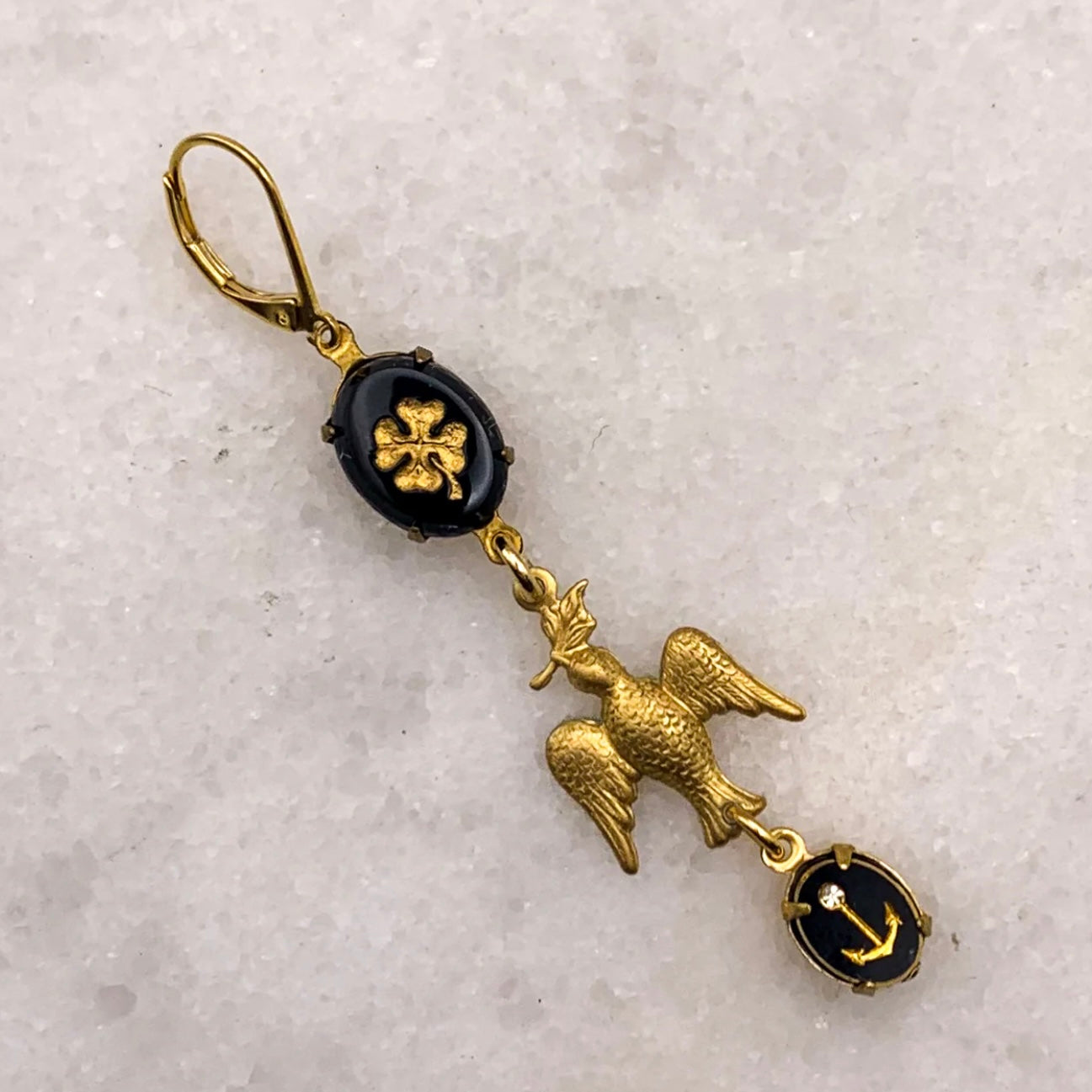 Beautiful Peace and Luck earrings shimmer with good luck and peace totems to bring you joy. Featuring a golden carved dove of peace with French jet and gold four leaf clover and anchor. Combining rare gems and vintage components, Australian designer Ghost and Lola create contemporary jewellery, offering glamorous and exquisitely detailed hand crafted limited edition pieces.