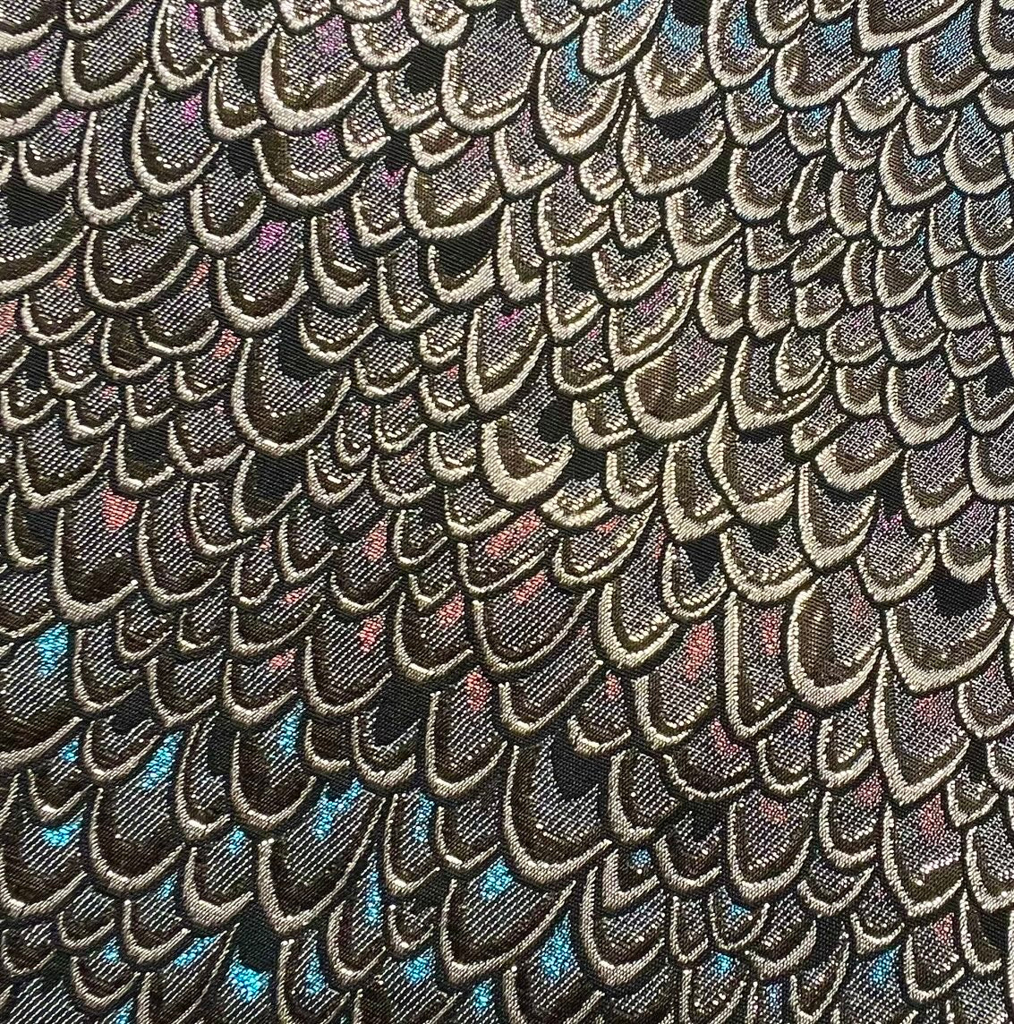 - Striking luxe metallic 'scales' in shades of silver and black with a hit of pink and blue.